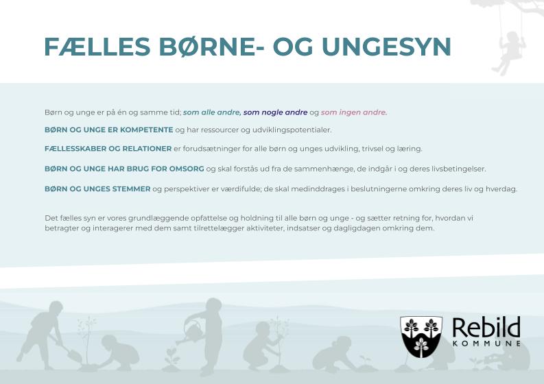 Som led i forankringen af Vision 2030 er der vedtaget et fælles børne- og ungesyn for Center Børn og Unge, Center Familie og Handicap, Center Arbejdsmarked og Center Kultur og Fritid - det vil sige, alle der arbejder med børn og unge i Rebild.
